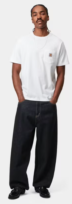 Le pantalon Brandon est réalisé en denim Smith, un coton épais, et adopte une coupe droite ample à entrejambe bas. Il est doté d’une couture incurvée à l’arrière, de plusieurs poches et d’une étiquette carrée cousue.