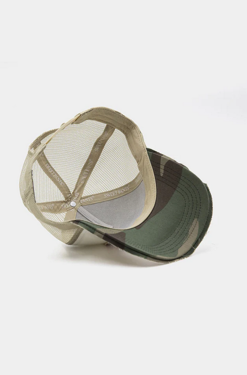 – Patch logo Sweet Pants sur le devant avec tranche visière effet « destroy » et tissu envers visière imprimé camouflage
